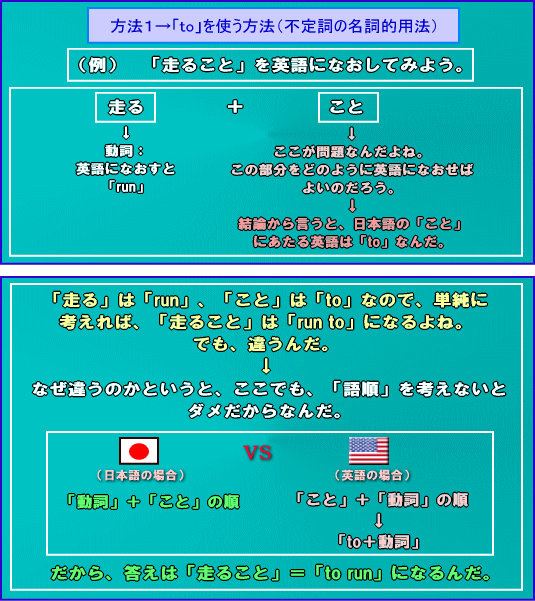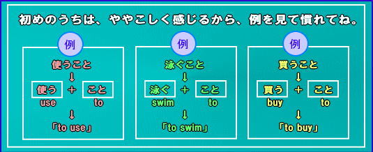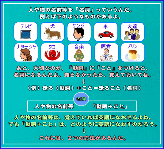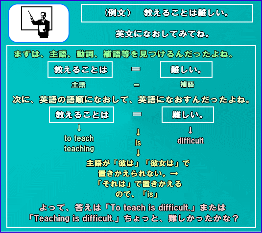 前置きが長くなったけど、このレッスンでは、主語、目的語もしくは補語のところが少し難しくなるよ。つまり、このレッスンを学習すれば英単語を覚えていても、日本語に出来ないような文章も英語にできるようになるよ。具体的には、主語、目的語もしくは補語の部分が、「〜すること」のとき、どのように英語になおせばいいのかについて書いているよ。