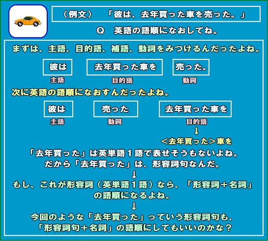 というわけで、レッスン18なんだけど、このレッスンでは、形容詞句(節)を、英語になおすための「準備」をするよ。具体的には、いきなり、形容詞句(節)を英語になおすのではなくて、英語になおすとき、どのような語順にすればいいのかを解説するよ。少し難しい日本語を、英語の語順になおす練習をするわけだね。