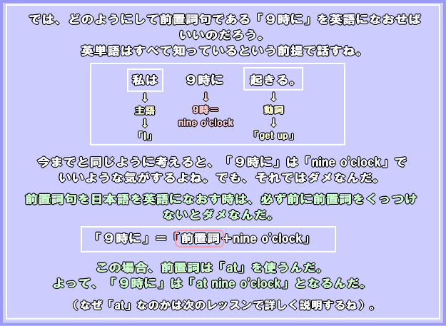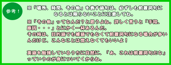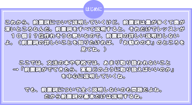 実際、前置詞は難しくて、奥が深いところだから、とりあえずは、細かいことを気にせずに、このレッスンに書かれていることだけを身につけるといいよ。細かい話は、もっと英語学習が進んでからでいいよ。ここでは、前置詞が必要なときは、どういうときなのか、わかりやすく解説しているよ。