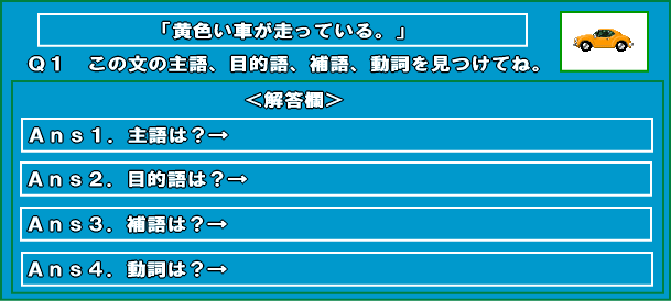 Q1:主語=黄色い車が、動詞=走っている、目的語、補語はありません。