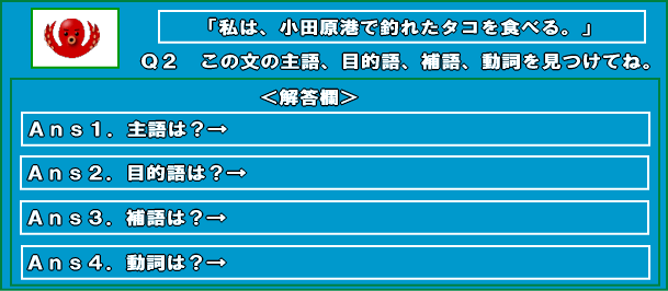 Q2:主語=私は、目的語=小田原港で釣れたタコを、動詞=食べる、補語はありません。