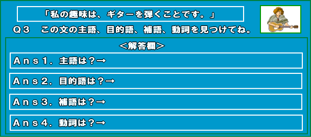 Q3:主語=私の趣味は、補語=ギターを弾くこと、目的語、動詞(一般動詞)はありません。