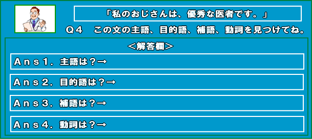 Q4:主語=私のおじさんは、補語=優秀な医者、目的語、動詞(一般動詞)はありません。
